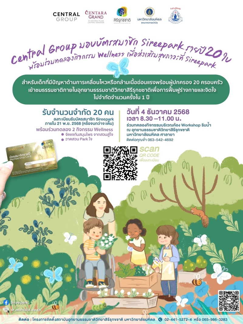 6 ธันวาคม 2025Central Group ร่วมกับ โครงการจัดตั้งสถาบันอุทยานธรรมชาติวิทยาสิรีรุกขชาติ, Centara Grand at Central Plaza Ladprao Bangkok คณะกายภาพบำบัด และโรงเรียนศรีสังวาลย์ ร่วมจัดการทดลองกิจกรรม Wellness เพื่อสุขภาพแบบองค์รวม สำหรับเด็กที่มีปัญหาด้านการเคลื่อนไหวหรือกล้ามเนื้ออ่อนแรง 20 ครอบครัว🌿